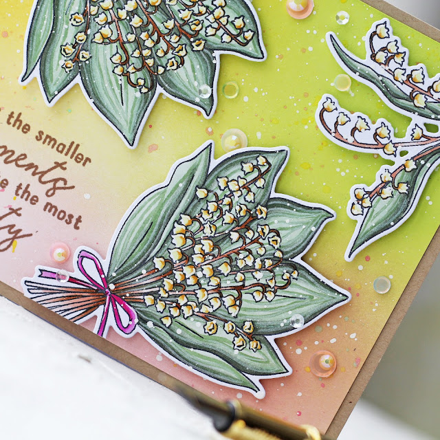 ОтветитьУдалитьI love the colors you used with your lily of the valley stamp. Your card is different from the others I have seen and it is very unique. Thanks for sharing your inspiration with this set and with the orange blossoms too.